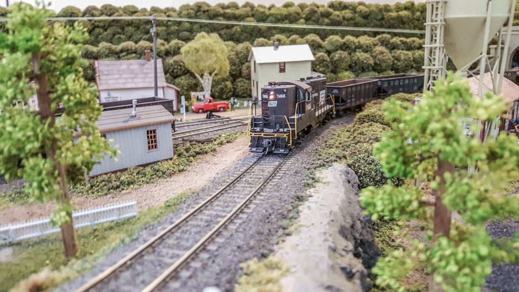 This week’s photo shows GP9 7466 climbing the grade on its way to Morris Fork with empty hoppers:
