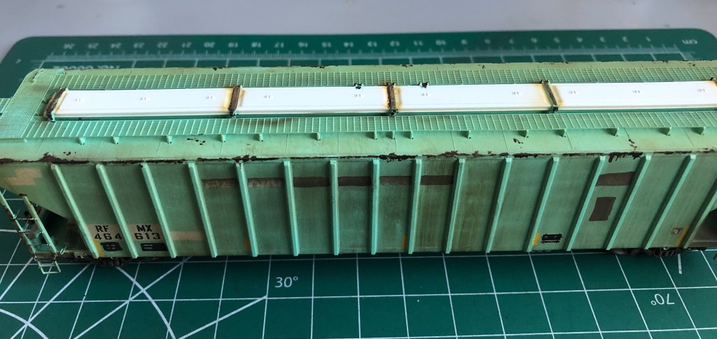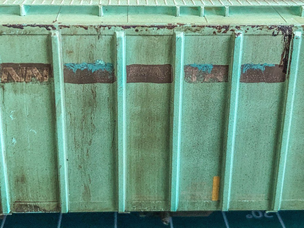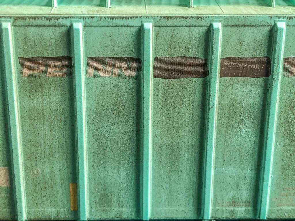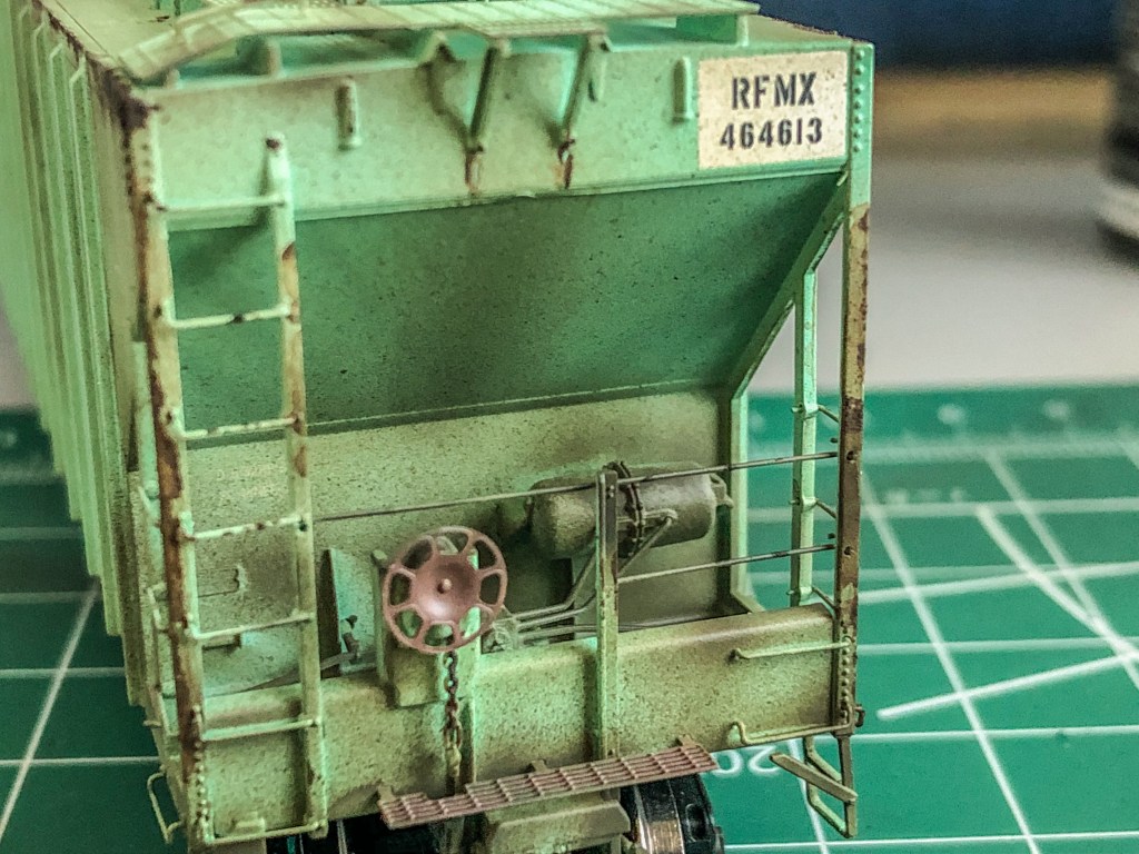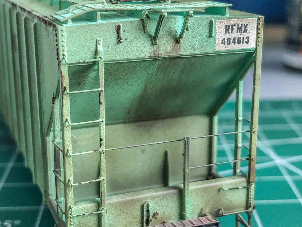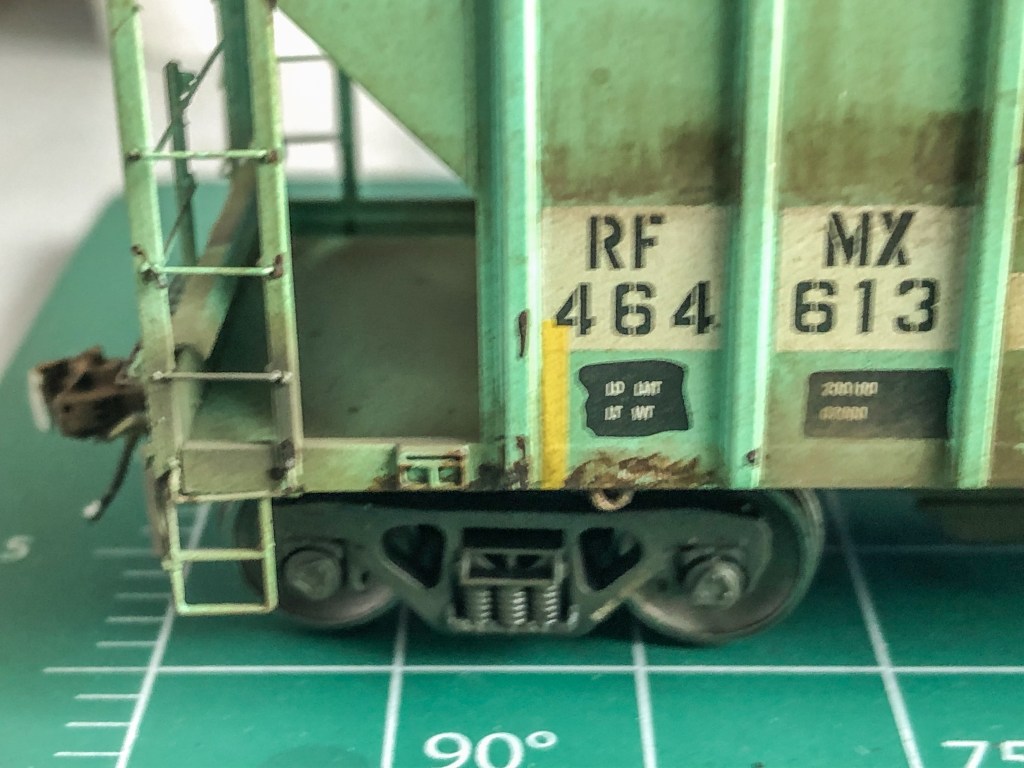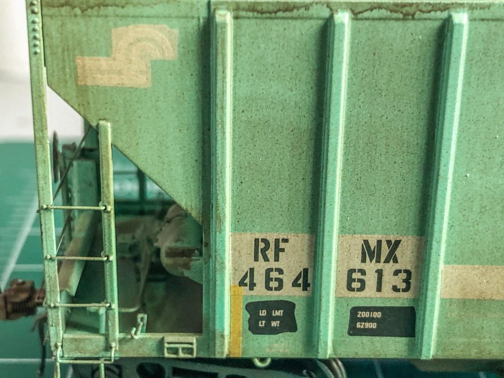 The hopper is an ex-PC then ConRail car, patched for RFMX. Obviously as shown the old Penn Central lettering is showing through along with the CR logo which had to be covered over and masked. Other areas were also patched and re-stenciled. This car took about two weeks to do with all the different mediums, patchwork, and decal work. Hope you enjoy the photos!