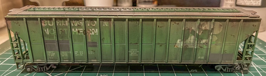 One of my current projects is reworking this BN covered hopper. I’ve had this car for awhile so don’t recall the manufacturer. The car only had a light weathering as shown below while on my eBay store: