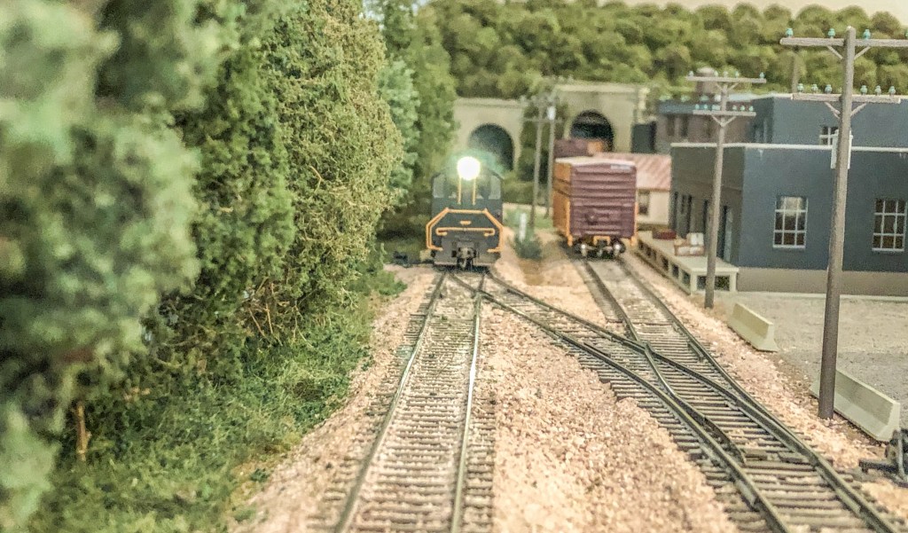 This week’s layout photo shows a Penn Central Alco as it brings its train back through Nitro, WV