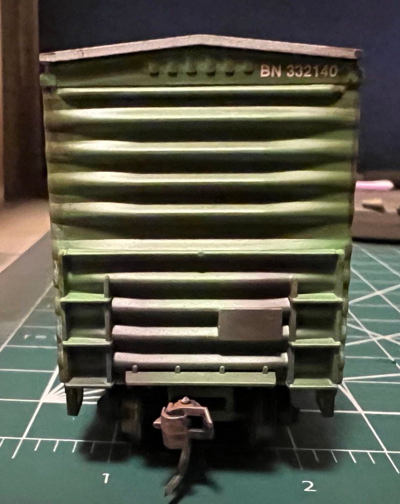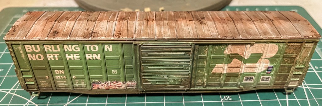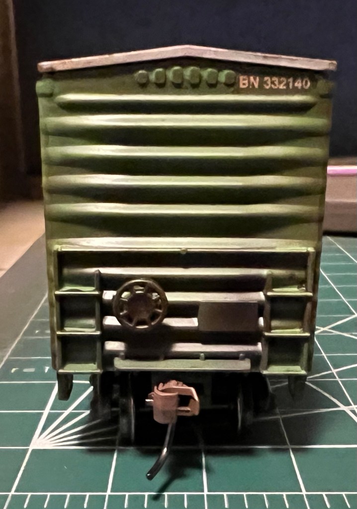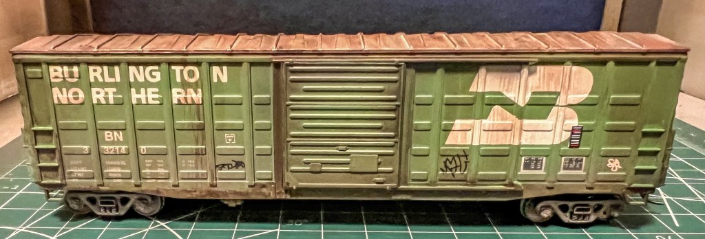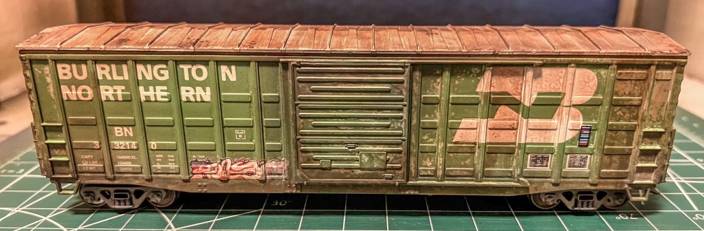 Hot off the press is this BN 50’ boxcar, thoroughly weathered with peeling paint, rust, streaks, and hand drawn graffiti. ACI plates added. Just went on eBay: