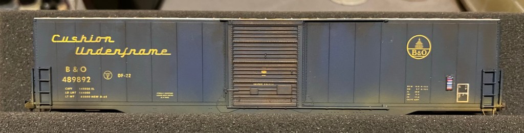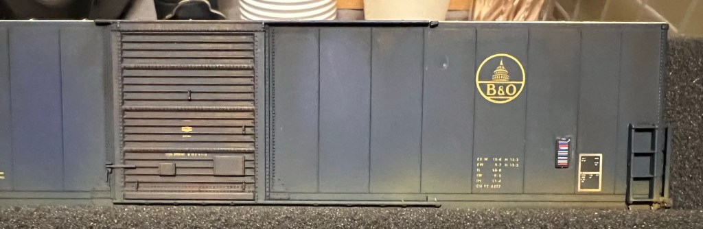 While working on the C&NW open hopper, I pulled these two cars out of one train box to weather up for eBay. These two B&O 60’ auto parts boxcars are Walther’s cars, purchased many moons ago while at Caboose Hobbies.