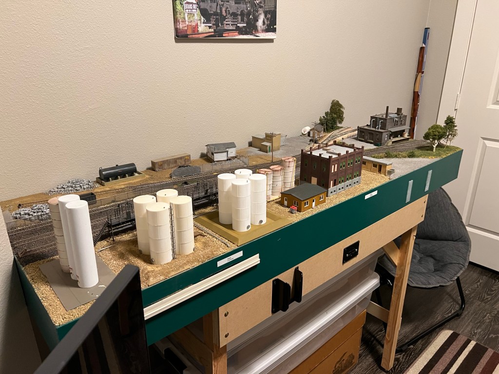 All the buildings I needed are in place now, along with all the fencing and trees I’m going to need. I still need to glue down some ground cover and ballast I had to put down.