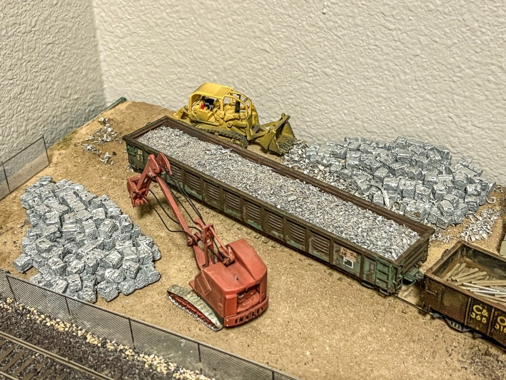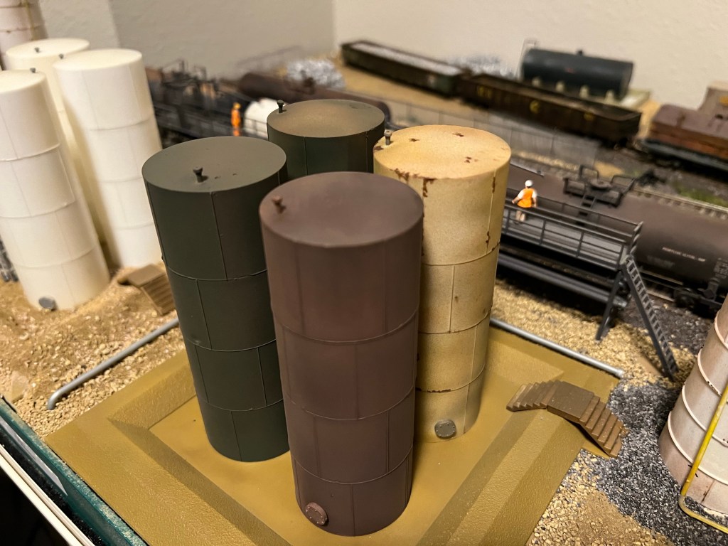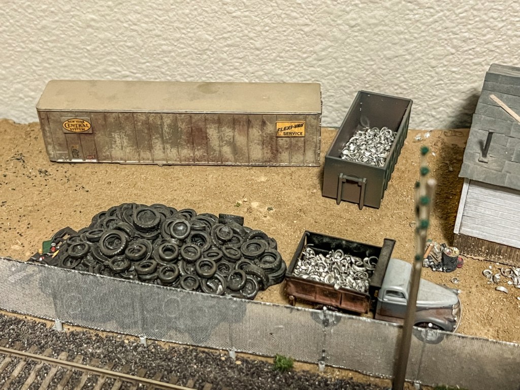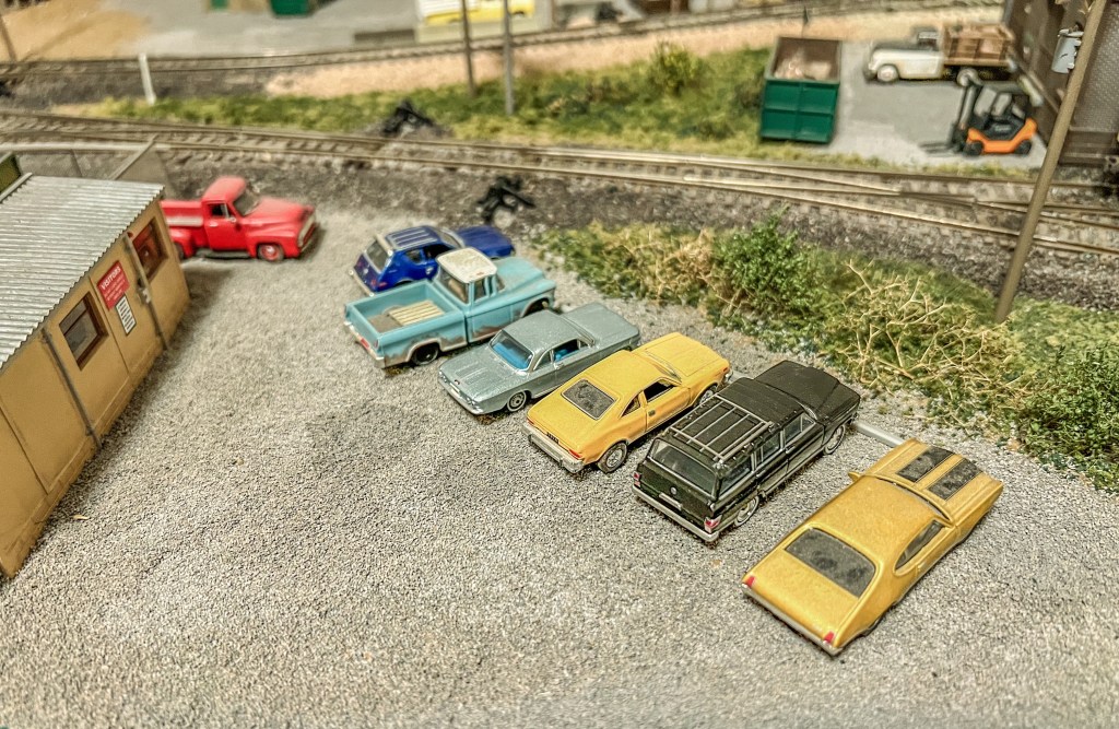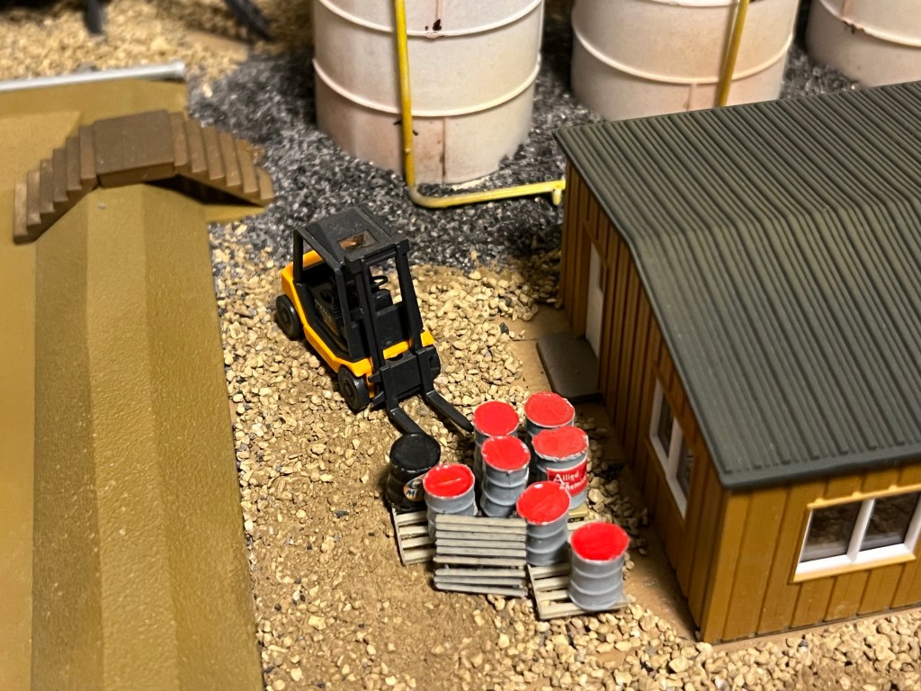 Among the details I’ve added which you’ll see below are weeds, scrap, fire hydrants, trees, people, plenty of vehicles, roll off dumpsters, etc, etc. more of the chemical tanks have been painted and weathered with some ladders still to be installed. One area I’ll dirty up further is the scrapyard with some oil soaked ground and more trash with some probably outside the scrapyard alongside the tracks. I’m also considering putting some weeds climbing up the scrapyard fence in some places. More photos will follow, but for now here are quite a few photos of recent work!