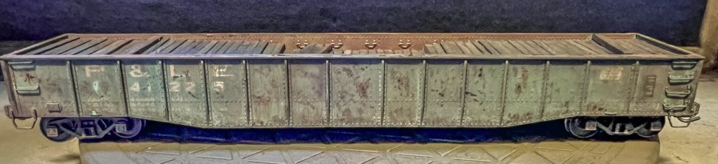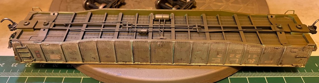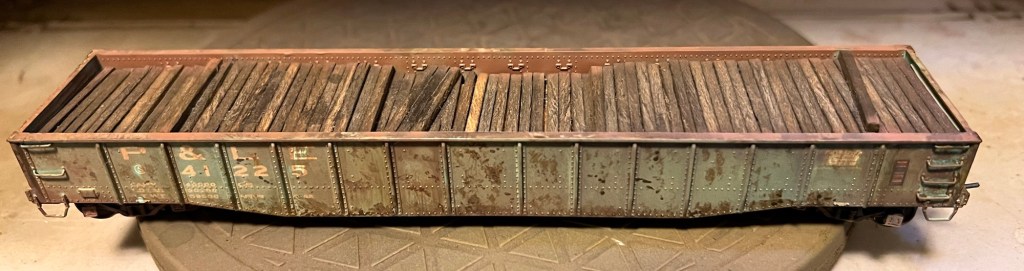 First off, the tie load was reworked using stains by Hunter Line, then the interior of the gon was airbrushed with Vallejo rust color acrylic. I also painted and weathered the underside which previously wasn’t touched with a grimy black/ brown mixture.