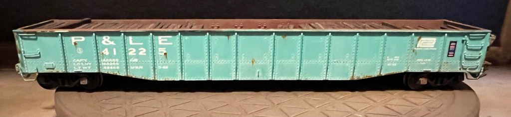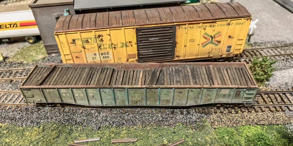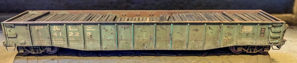 In this post I’ll show an older car I’ve had for some years on the old layout that I decided to rework and weather, then keep in the fleet. This car I believe is an older Roundhouse model with a tie load. This car started out as shown below: