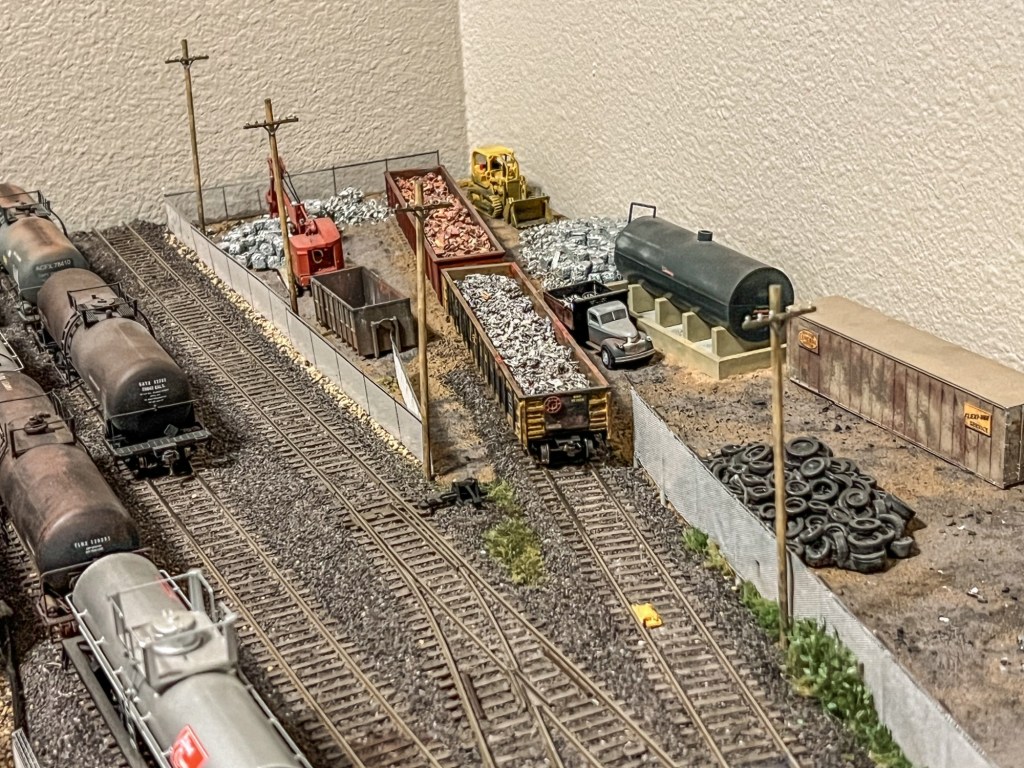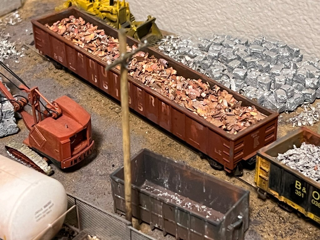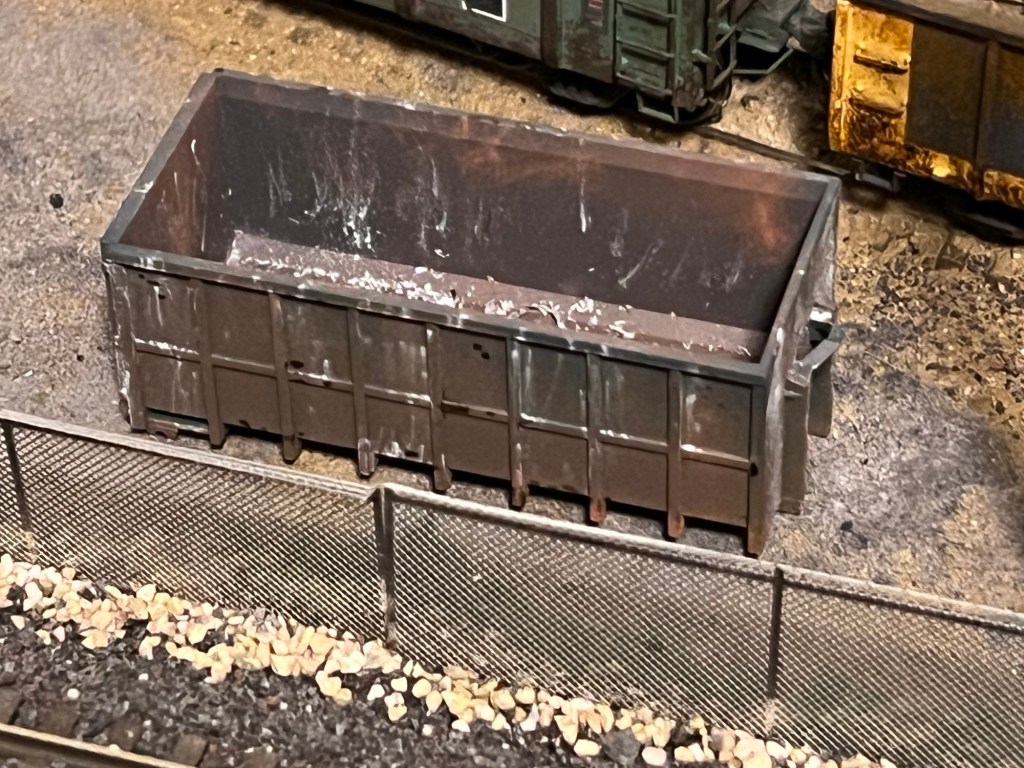 And, I’m still going on small, quick projects! Here’s another one to enhance the scrapyard a bit, the detailing and weathering of the Walther’s dumpster inside the scrapyard. This was done with powders and dry brushing. I think the result turned out great! Photo below: