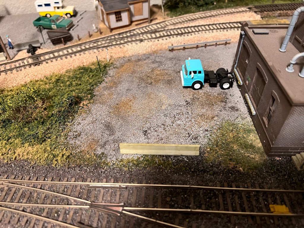 These small projects include the addition of “industrial dirt” by Arizona Rock & Mineral to both the scrapyard and area outside of it, plus the parking lot area of Allied Chemical. Also applied this dirt to the loading area at Armitage Furniture. As a commenter mentioned on my Facebook group concerning the look of the finished areas that these areas in real life are not uniform in color, they’re various colors of stains, gravel, and dirt. I agree and I hope I’ve achieved this look in the photos below: