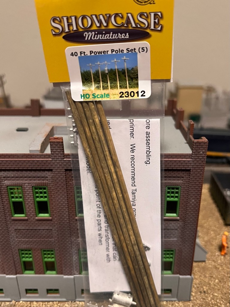 Another small project was the purchase of more realistic utility poles from a company I found on eBay, to replace the plastic poles on the layout. Photo below of the poles: