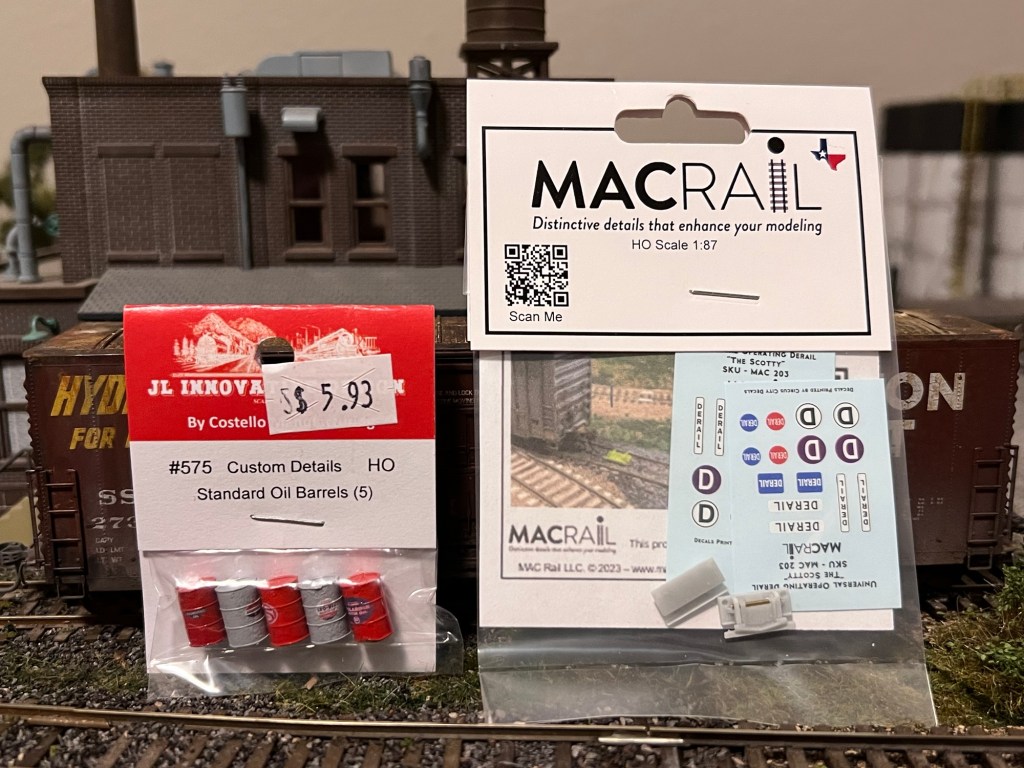 Finally, I needed a few more operating derails, as some of my previous ones on the original layout wouldn’t work or were broken trying to salvage them. The previous derails were made by the same person who produces the ProtoThrottle, but stopped making them. A new company took over production and sales of these as shown below. I purchased these at our recent train show here in Denver, which is the largest show of the year. I also purchased red flags that go into the coupler at the end of a cut of cars. Both shown below: