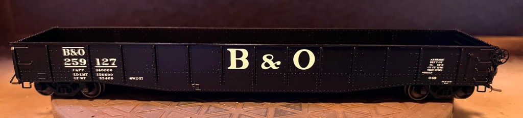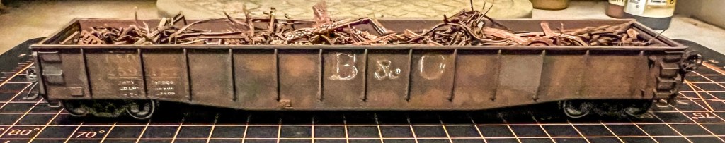 Next project about 2/3rd of the way finished. This is a Tangent 52’6” 70 ton gondola lettered for B&O. I’ll have patched areas where the lettering will go, plus lube stencils and ACI plates. The car was faded first with an acrylic, then rust acrylic sprayed inside the gon, underside was painted with a grimy black/dirt combination, then brown wash applied with dirt and black plus grey powder applied over top while still wet. The sides and ends of the car was then painted over with Vallejo rust texture, then dabbed with MIG Ammo track rust while still wet, with a bit of the lettering uncovered. Trucks will be painted with roof brown then dusted with powder with wheels and axles painted in Tamiya NATO brown. New scrap material finishes this off: