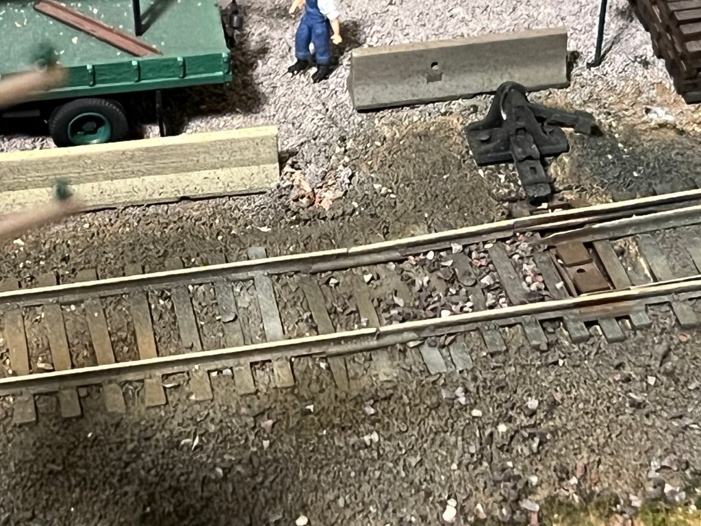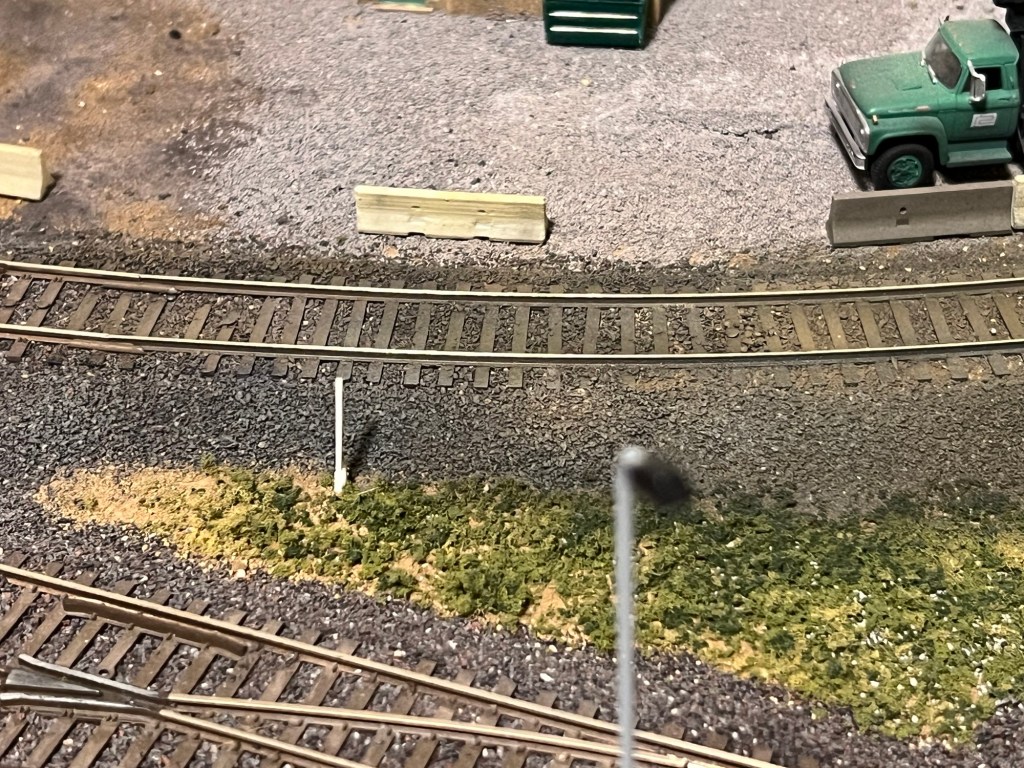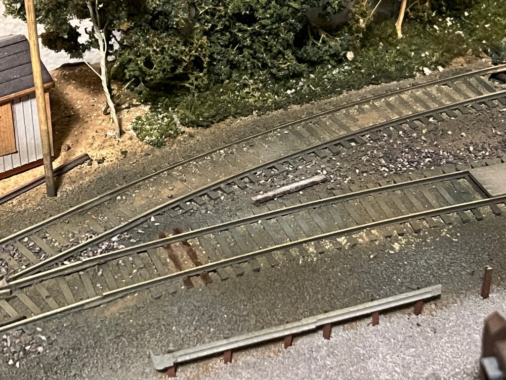 I didn’t like the sudden transition to the Arizona Rock & Mineral limestone ballast on the module, so I spent the morning painting over it to try to match their yard mix ballast on the rest of the modules, then weathered a bit of it per a video I came across on YouTube. Used a marker as well to get the grey tie plus brown for several new ties. Different Vallejo paint colors were used. I may still dry brush some warm grey over the painted area. I think I came pretty close to matching the yard mix ballast. Last photo shows the limestone ballast: