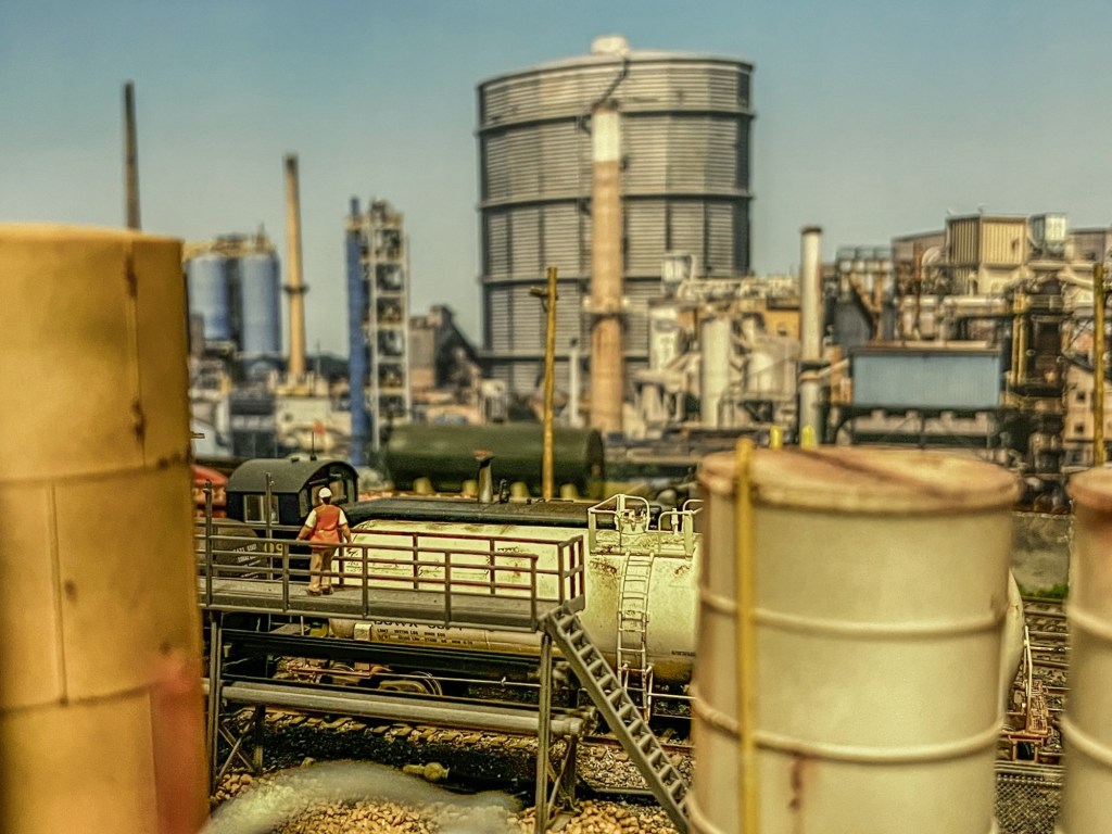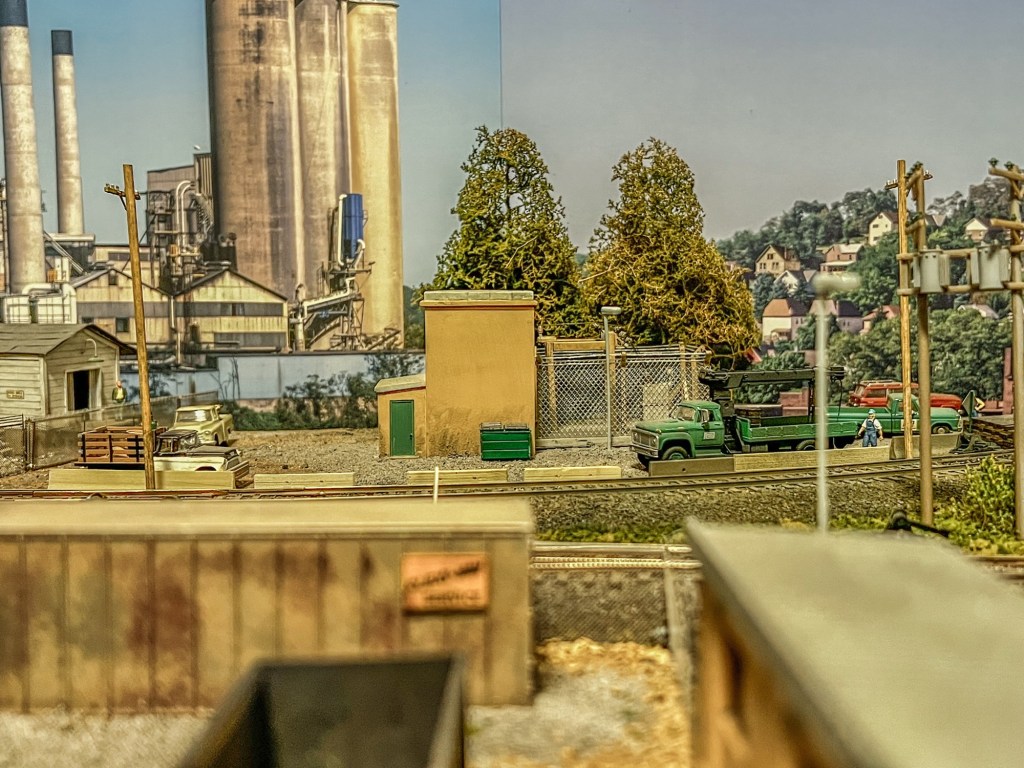 These were installed yesterday directly to the plain white wall behind the layout with Velcro strips and I must say they make all the difference in the layout! Take a look at the photos below and I think you’ll agree, especially the photo showing the plant behind the scrapyard! The view makes it appear as one huge complex.