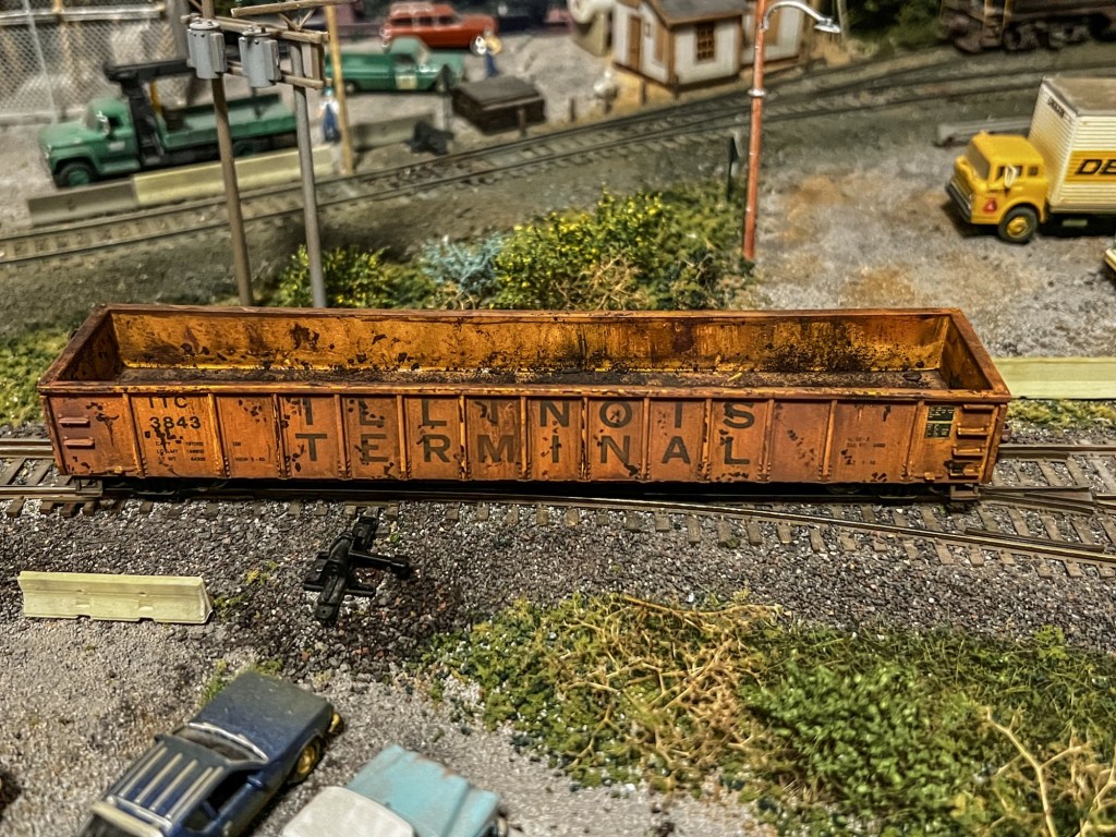 The above photos were taken before I applied another layer of rust texture by Vallejo. Inside the gondola bed is a rust wash, rust acrylic paint, rust texture, and two pigment powders by MIG AMMO. I’ll also apply ACI plates by BLMA.