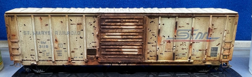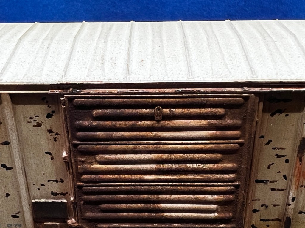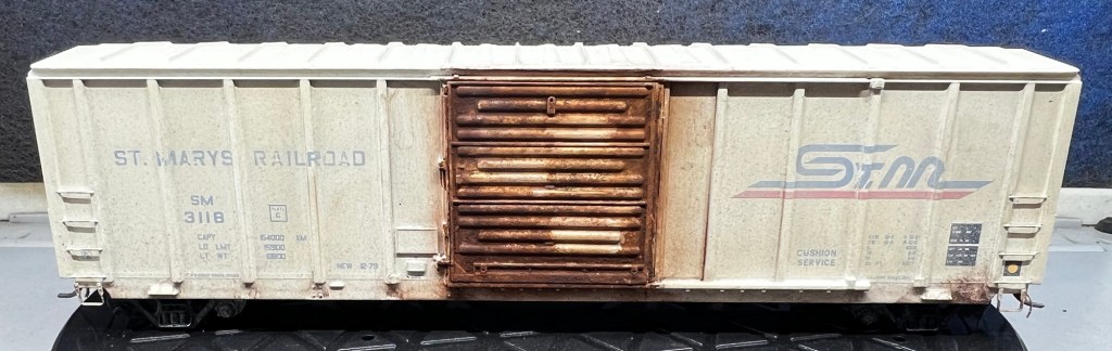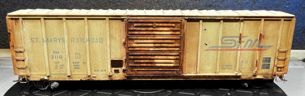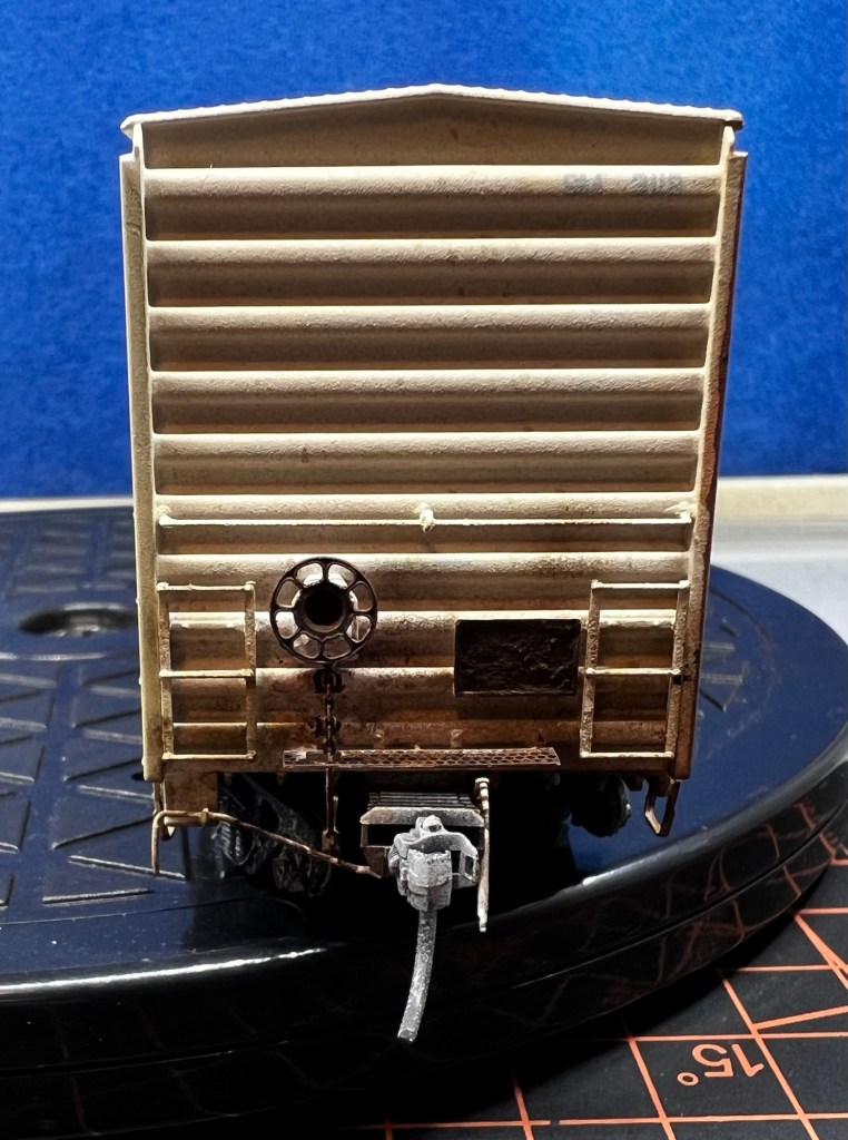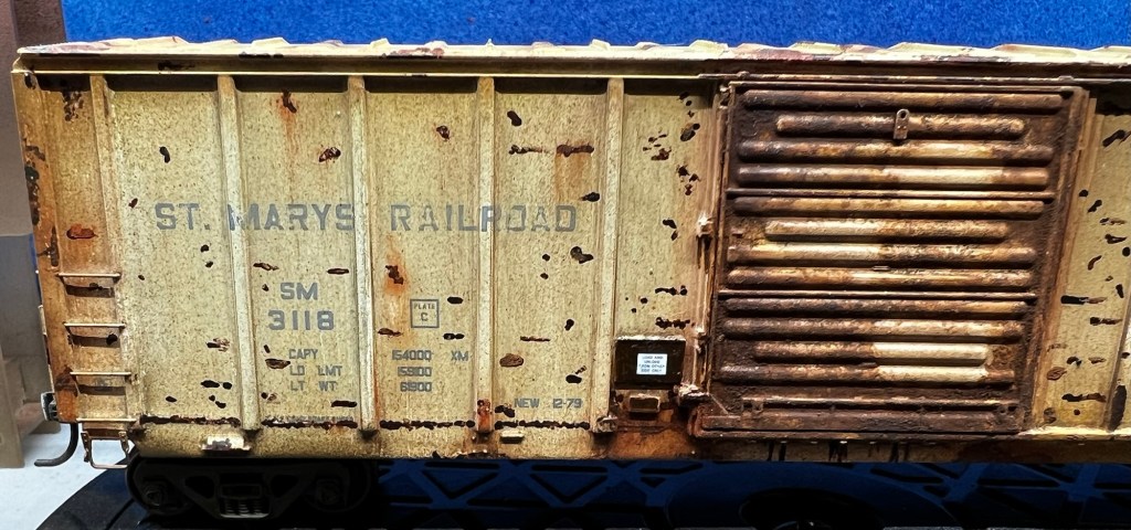 Here again is another recent project that just sold on eBay! This guy was purchased new off eBay from a local modeler. This is an Atlas 50’ ft boxcar , and below is how it looked out of the box. Actually, photo below as it appears after a fade coat!