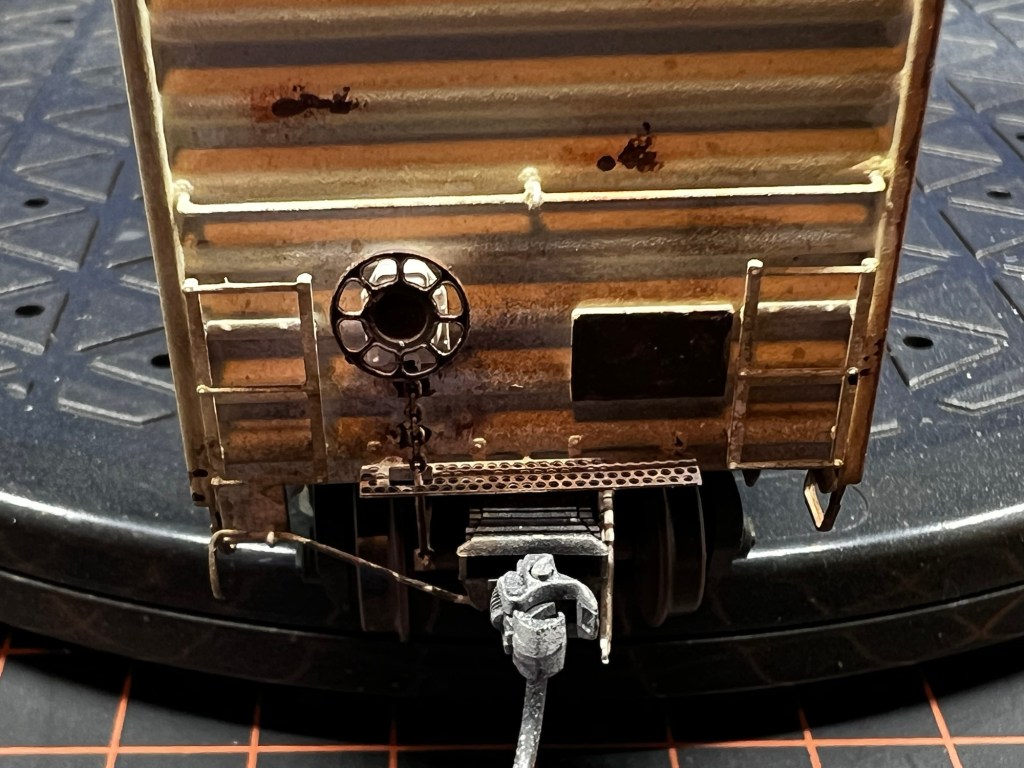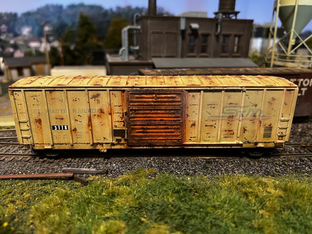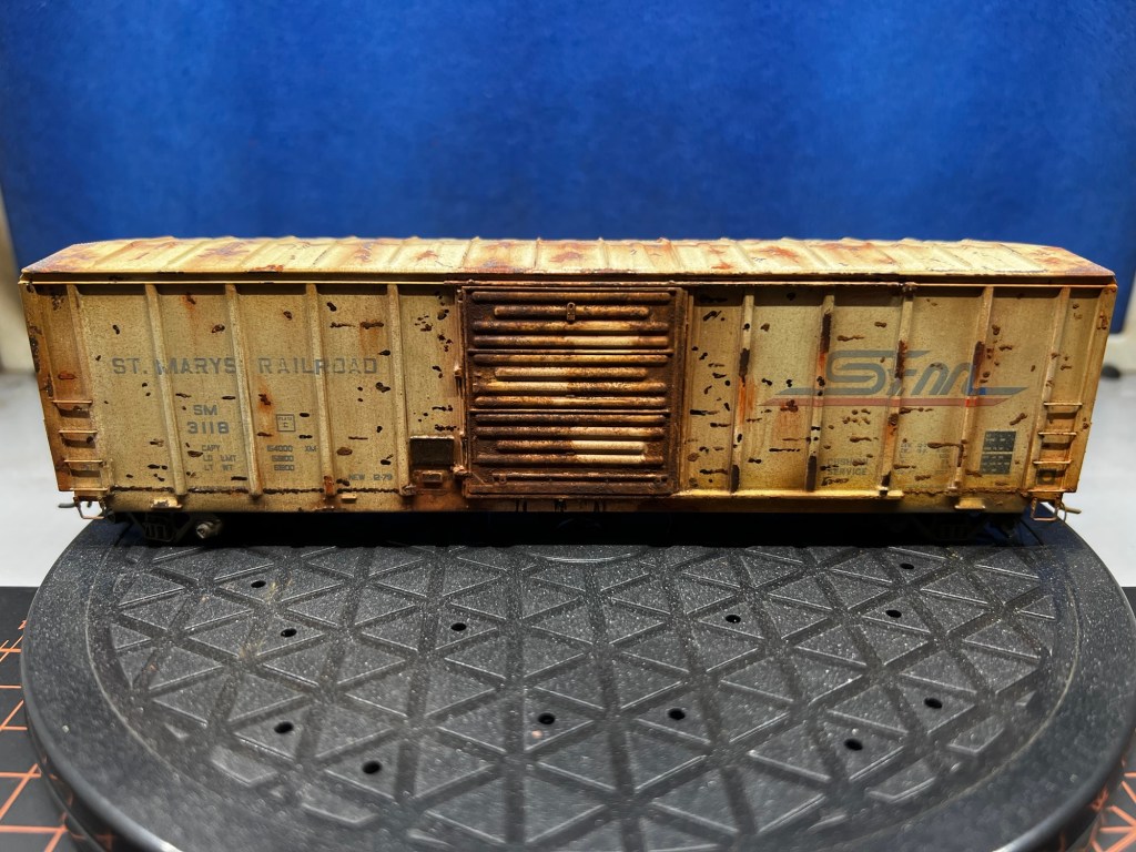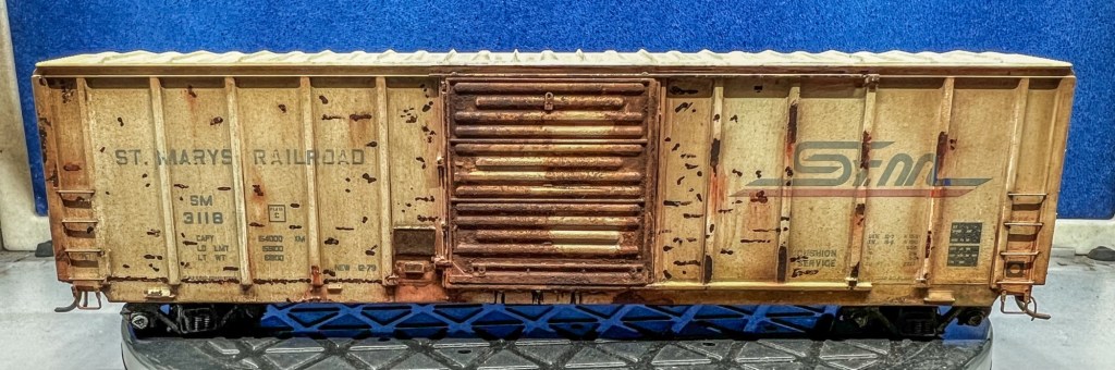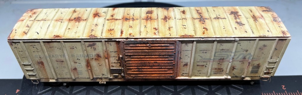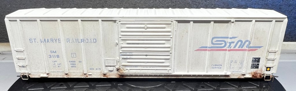 Here again is another recent project that just sold on eBay! This guy was purchased new off eBay from a local modeler. This is an Atlas 50’ ft boxcar , and below is how it looked out of the box. Actually, photo below as it appears after a fade coat!