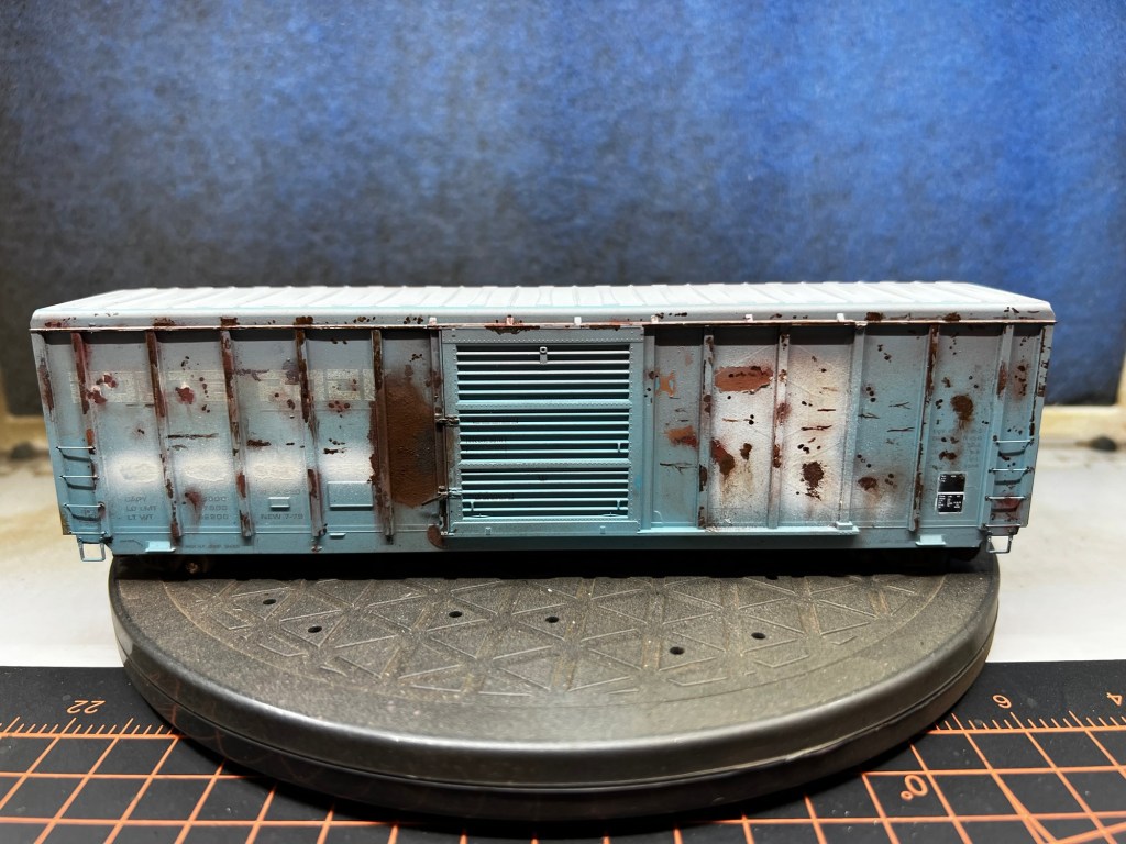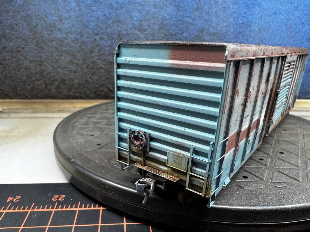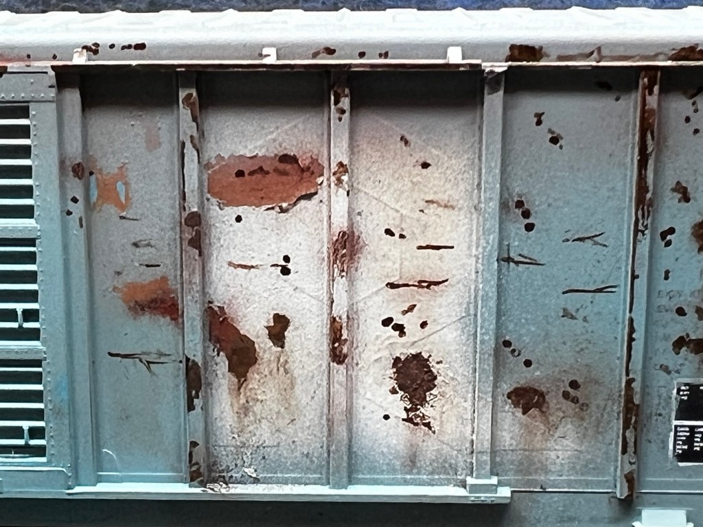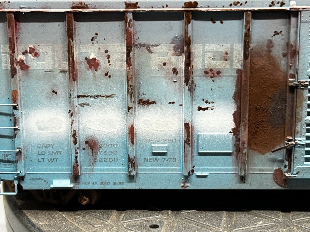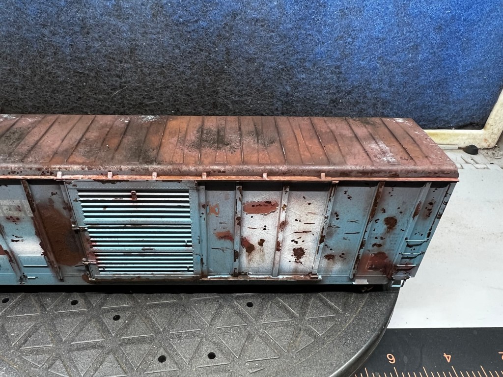 Here below are photos of progress on the current project for eBay. Roof was done with five different mediums and has a rust texture and feel to it. One side is basically almost finished weathering wise. Graffiti needs to be applied as yet and faded per the prototype. Areas were patched today for new lettering plus some built up grime applied to the bottom of the ends of the car. More photos coming as this progresses!