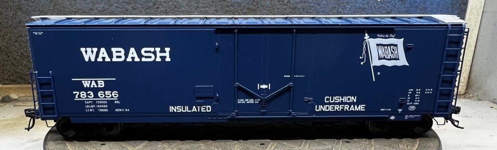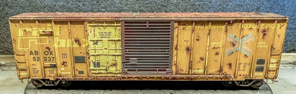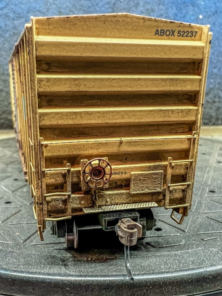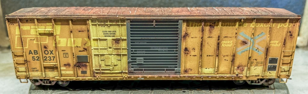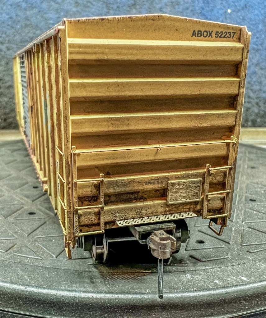 This guy is now finished and on my eBay store! This car was completed using two different rust textures, washes, three colors of acrylic paint, and pigments. All told this car took about a week to complete. Below are photos of the finished car, plus the next project up, this Moloco Wabash boxcar which I hope to replicate the prototype car shown. Stay tuned!