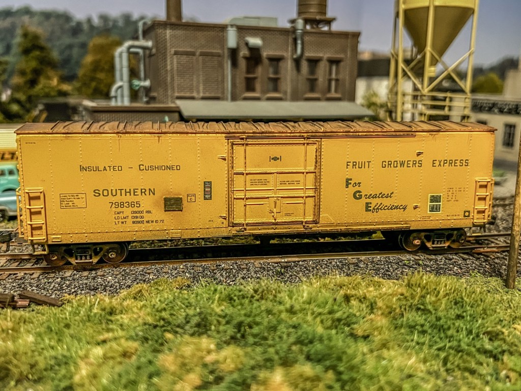 This Athearn car has also been finished and is now on the layout. This car was faded with a few brown washes applied plus different textures and pigments on the roof: