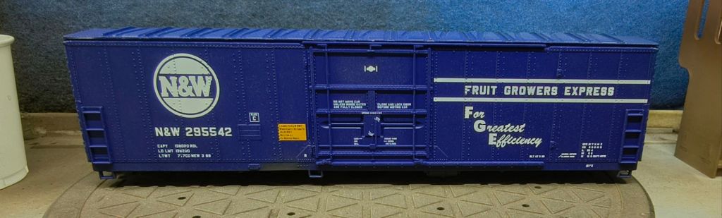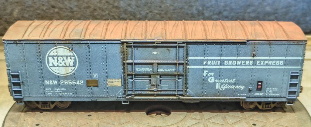 One of the most recent projects was this Walthers Mainline series N&W reefer. This was faded using Vallejo blue grey plus a touch of white acrylic, then going back over the lettering. Rust texture and some weathering powder was also used to finish up: