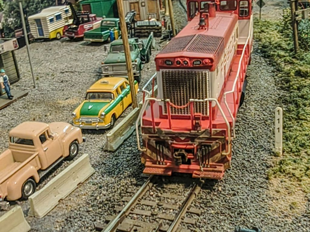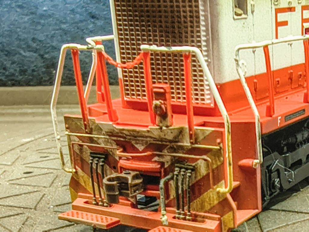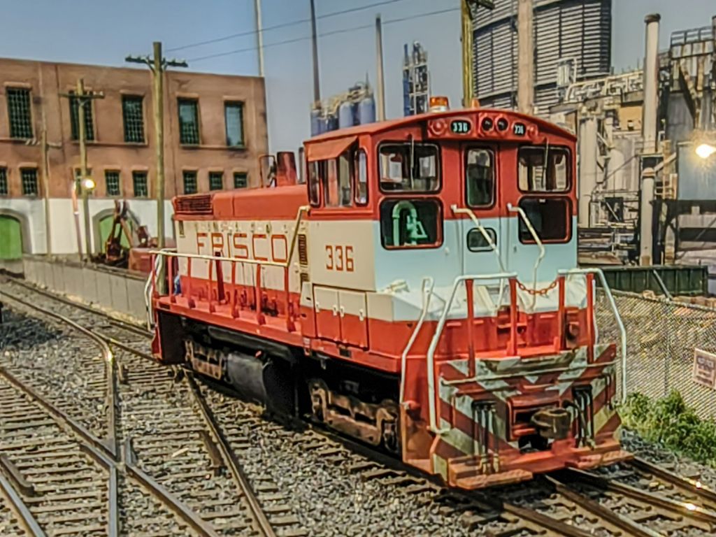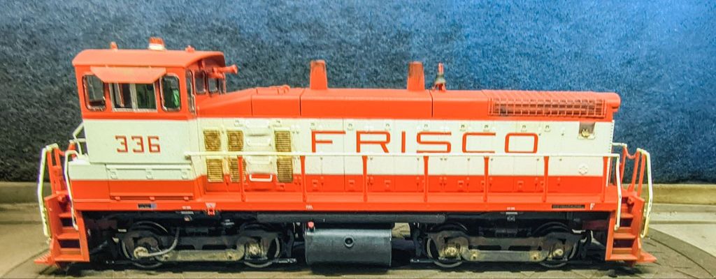 This is actually a most recent piece of commission work for a modeler in Arkansas, this Athearn Frisco SW1500. This guy was done with acrylic paints, wash, pigments, and actual soot on the exhaust stacks: