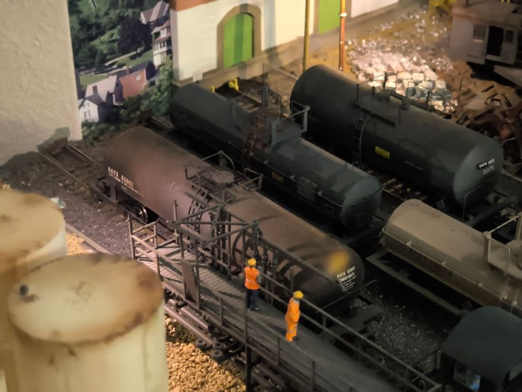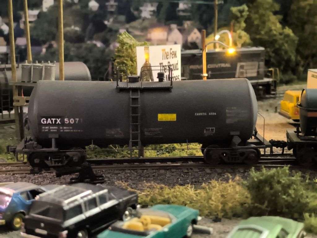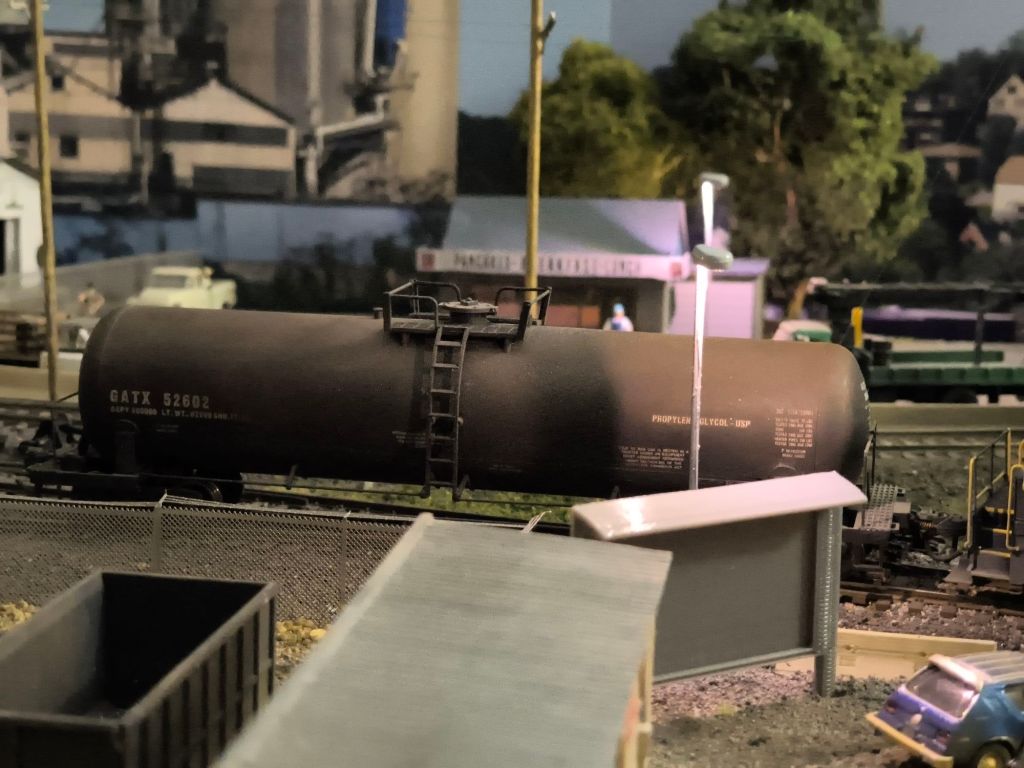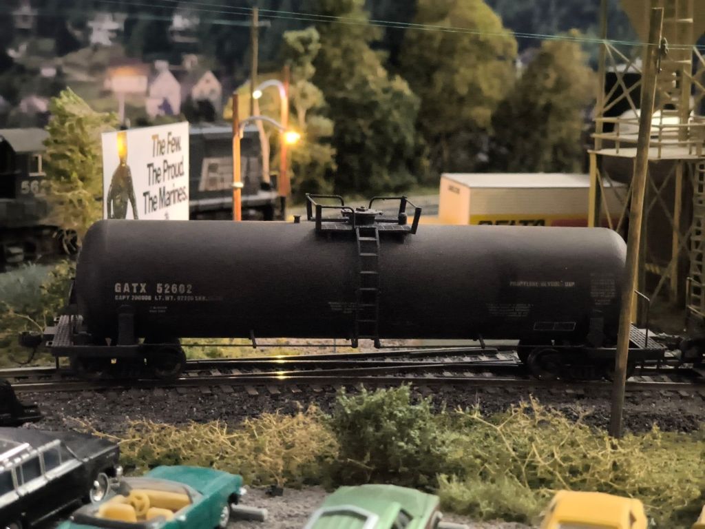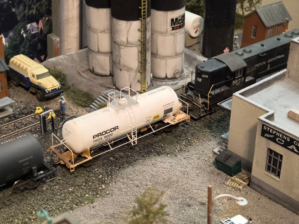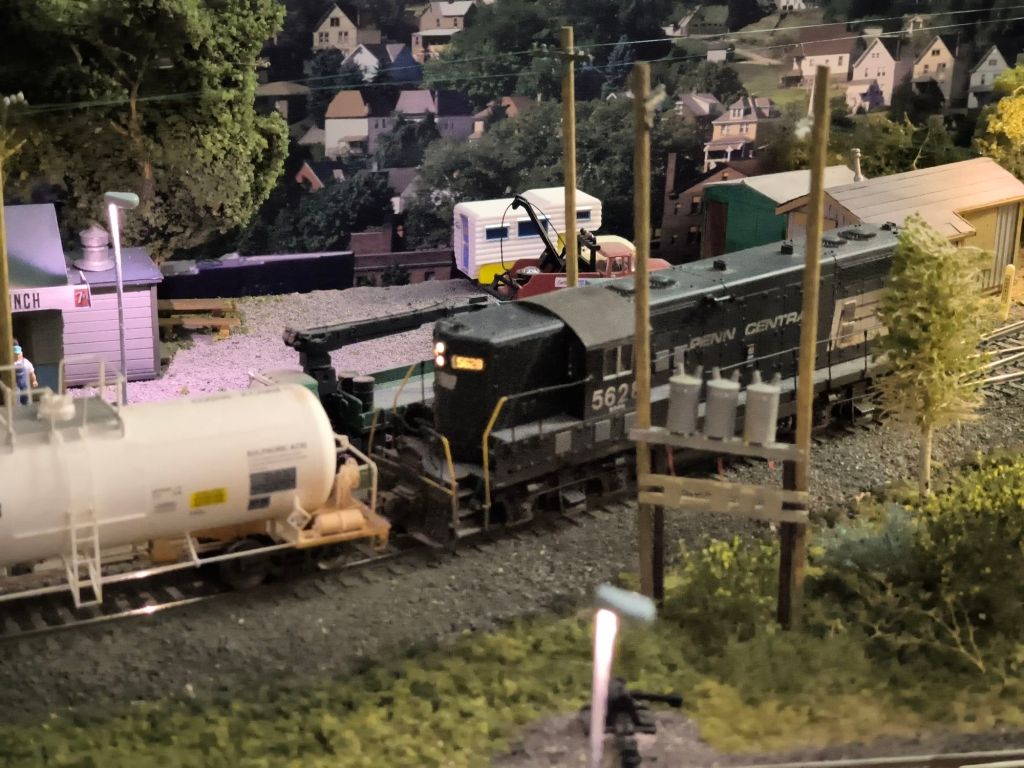 Street lights are already coming on as dusk is here. We’re going to pull out onto the main first, tie onto the local’s caboose, uncouple that tank of fuel oil, then shove it into McGraw fuel and oil. I’m on the ground today at this point doing the honors: