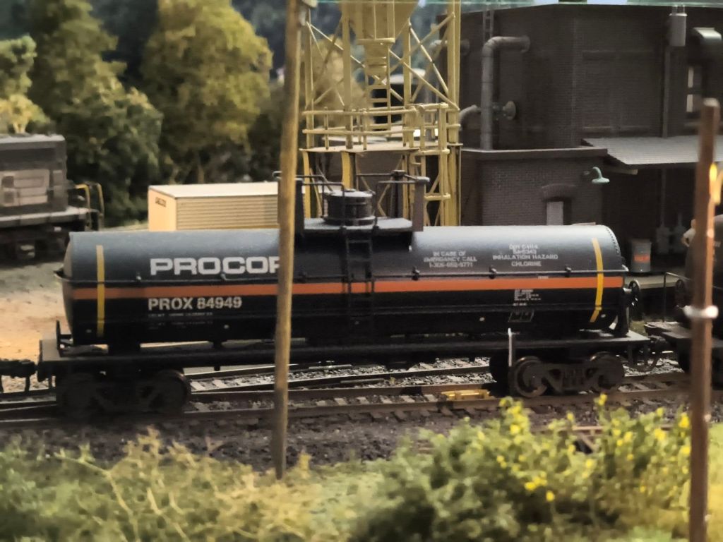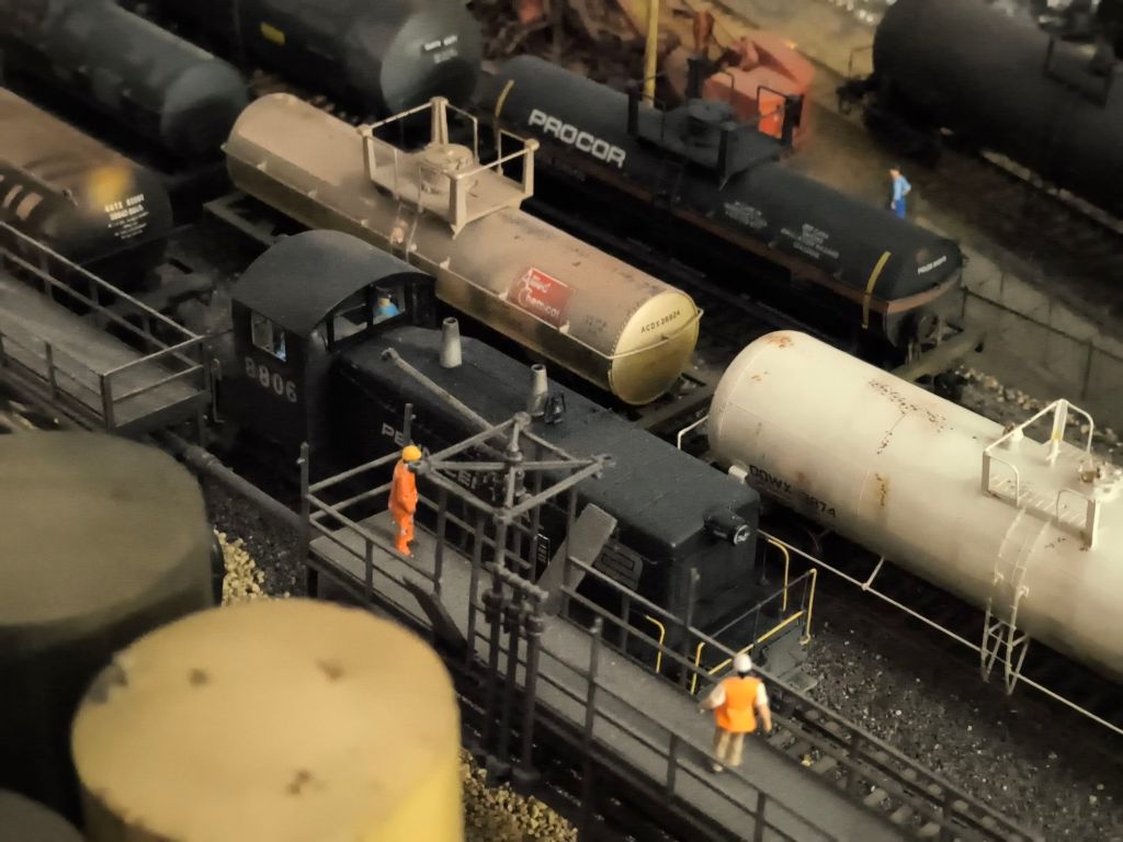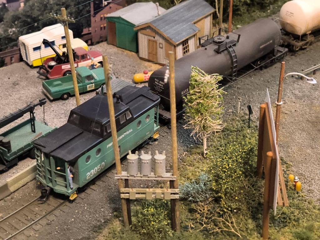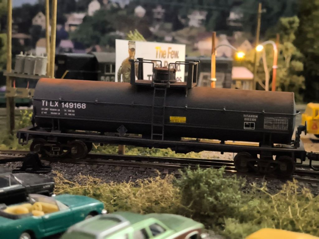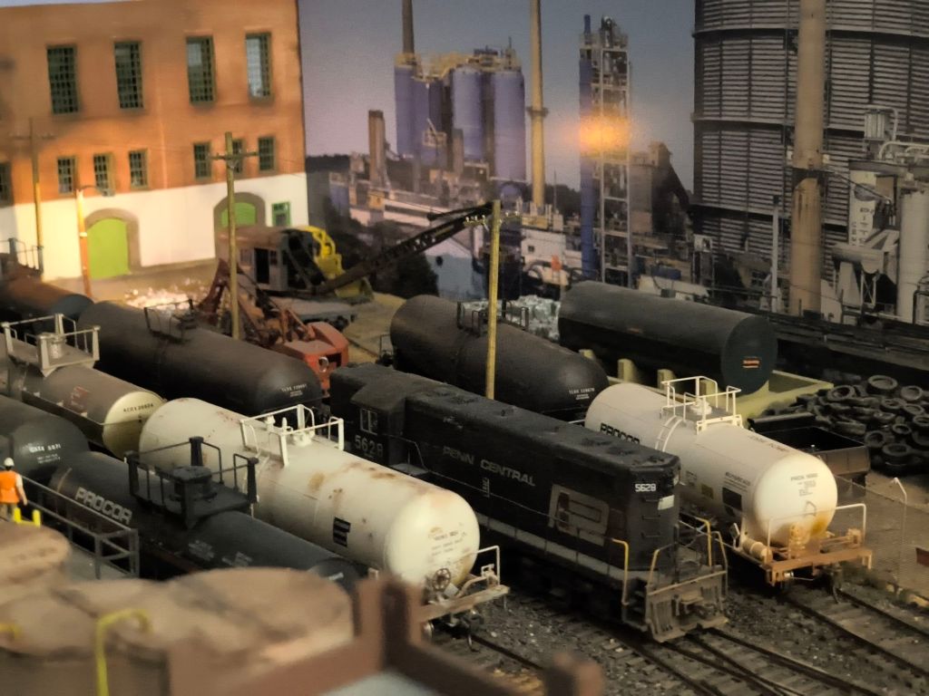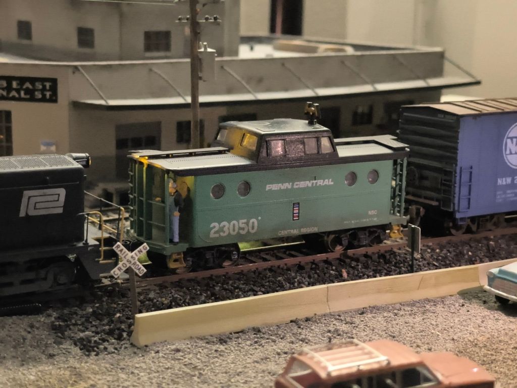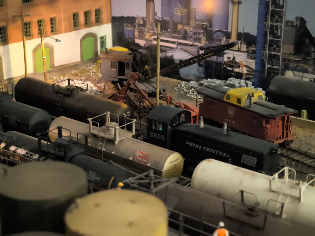 Street lights are already coming on as dusk is here. We’re going to pull out onto the main first, tie onto the local’s caboose, uncouple that tank of fuel oil, then shove it into McGraw fuel and oil. I’m on the ground today at this point doing the honors:
