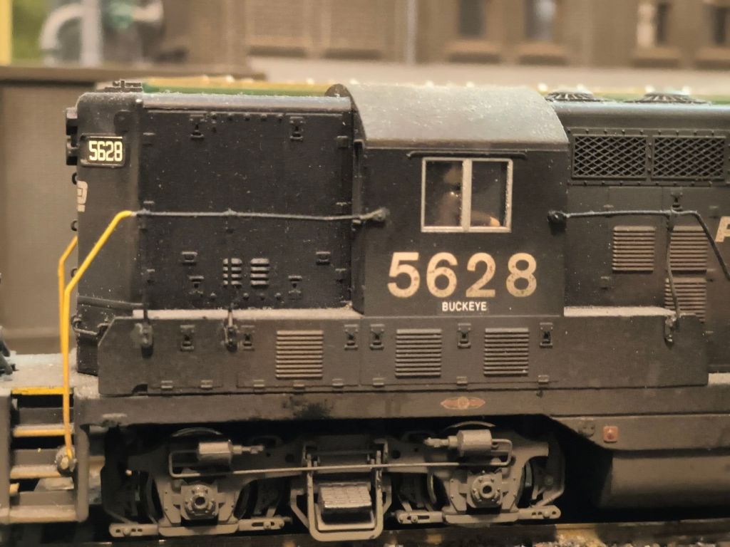 Just a short post today showing a bit of the weathering on my old standby, GP7 5628. Unfortunately the photo doesn’t show the rust on the cab roof. Looks like the old gal has been sideswiped at one time looking at that handrail stanchion! This locomotive is absolutely still my best locomotive, almost twenty years old i believe, manufactured by Atlas with a Kato drive, DCC and sound….